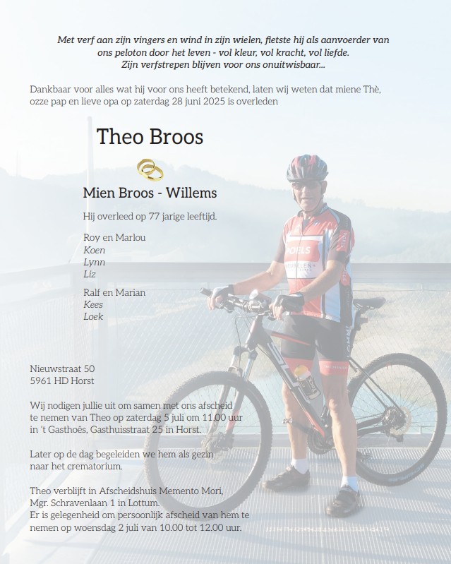 Wij als vereniging en fietskameraden nemen met veel verdriet afscheid van Theo Broos.