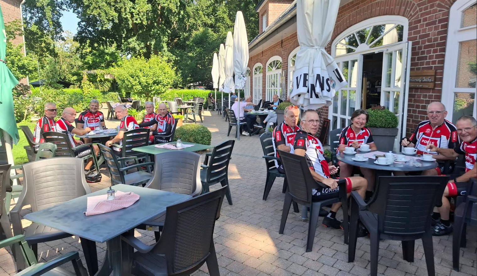 C-groep: Op deze frisse augustusmorgen verzamelden zich 14 C-rijders bij De Beurs in Horst. Met een temperatuur van 14 graden begonnen sommigen de rit nog met armwarmers aan, maar al snel gingen die weer uit – het beloofde een mooie dag te worden. De route voerde ons richting Venlo. Zoals altijd was het op de brug en door de stad goed opletten geblazen. Op de Zwarteweg kwamen we bij de eerste beklimming, en opvallend genoeg reed de groep deze gezamenlijk op. Bij de tweede klim, op de Schaapdijksweg, reed ieder zijn eigen tempo, iedereen op eigen kracht, maar boven wordt altijd op elkaar gewacht. Na de derde klim in Venlo fietsten we verder richting Duitsland, over het fietspad waar Thei Broos destijds het noodlottige ongeval overkwam. Op deze plek stonden we even stil voor een moment van herdenking. Voor ons blijft dit een bijzondere en beladen plek. Vanuit Herongen ging het verder via de bossen richting de Blue Lagoon en daarna naar Hinsbeck, waar we weer enkele mooie klimmetjes voorgeschoteld kregen. Ook hier gold: ieder zijn tempo, samen boven. Toen kwam de onvermijdelijke vraag: waar gaan we koffiedrinken? De keuze viel op het sfeervolle Bauerncafé Jacobs in Straelen. Daar genoten we van een welverdiende pauze met koffie en gezelligheid.