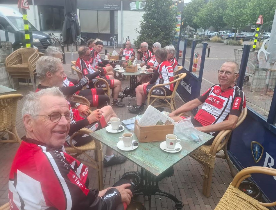 C-groep: Vanmorgen verzamelden we met 12 wielrenners van de C-groep en 2 renners van de D-groep bij de Beurs. Het was een frisse ochtend met een licht briesje – ideaal fietsweer. Op het programma stond Route 10, goed voor 78 kilometer. We vertrokken richting Meterik, waar Mat V. een alternatieve route nam door over het plein te fietsen in plaats van over de reguliere weg. Vanuit Meterik ging het verder naar Leunen. Daar bleek de weg “de Locht” onverhard, dus besloten we terug te keren richting de Venrayseweg in Castenray, waarna we de geplande route weer oppakten. Via allerlei mooie binnenwegen kwamen we in Milheeze terecht. Sommige renners vroegen zich hardop af: “Waar zijn we toch beland?” Maar de pauzeplek was nabij… althans, tot we werden opgehouden door een lekke voorband bij Christel. Helaas had Christel haar eigen materiaal niet bij zich – haar steun en toeverlaat Frans ontbrak vandaag door omstandigheden . Gelukkig werd er een binnenband geleend, en onze huismonteur Mart J. (in te huren voor een schappelijk uurloon…) zorgde vakkundig voor de reparatie. Daarna snel door naar de geplande pauzeplek: Herberg Thijssen in Vierlingsbeek – een klassiek bruin café waar je volgens Jan Z. zelfs nog tegen een muur moet plassen!
