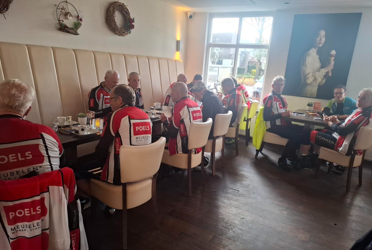 Bij Clevers genoten we van koffie met bonbon ( van Wilma’s traktatie, want is jarig geweest!). Er werd zelfs gezongen — de sfeer zat er goed in. Na de pauze nog 31 km bladeren ontwijken en bochten nemen alsof we in de Tour reden. Rond 11.50 uur terug in Horst, waar de gravel- en MTB-ploeg al aan het na borrelen was. Wij sloten gezellig aan.