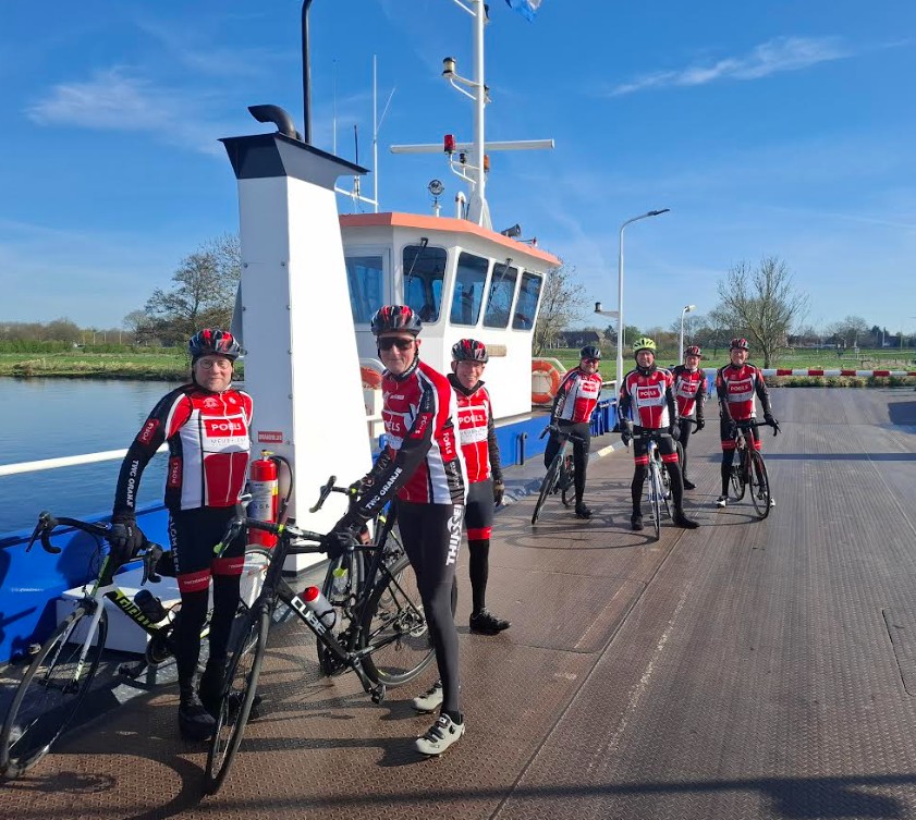 C-groep 2e paasdag:Na Eerste paasdag was het tijd om de heerlijke gegeten eieren te verteren met een mooie rit op Tweede paasdag. Het was een frisse ochtend, maar het zonnetje begon gelukkig al snel door te breken. Aan de start verschenen 17 wegwielrenners. Daarom werd er in twee groepen vertrokken om route 76 te fietsen. Met groep 1 reden we van Blitterswijck naar Well. Op de weg ’t Leuken kwamen we de D-groep nog tegen, die iets eerder was vertrokken. De D-groep nam de veerpont in Bergen, terwijl wij doorfietsten naar Afferden om daar de veerpont naar Vortum-Mullem te nemen.