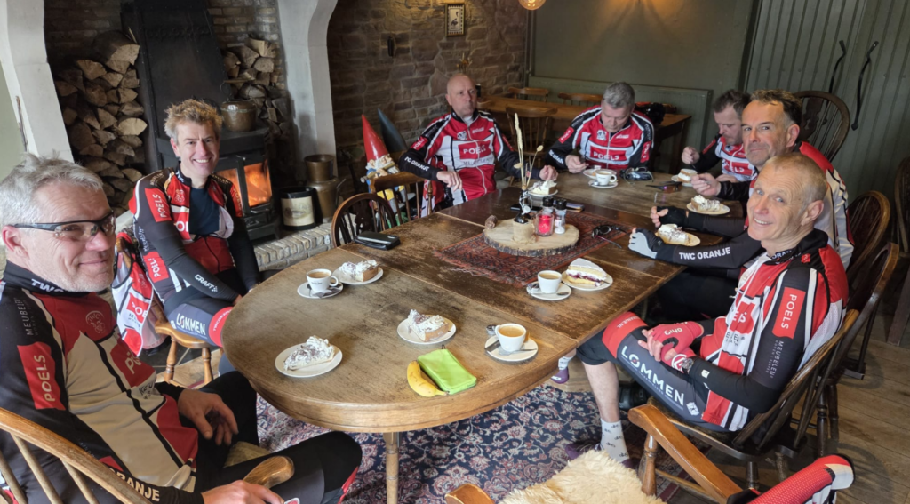 Na 1,5 uur koers en 35 km kunnen we inderdaad terecht bij de Busjop. En hoe: Een grote tafel voor de hele groep in het oergezellige historische restaurant bij de lekker warme houtkachel. Supersnelle en accurate bediening en overheerlijke koffie met ieder 1/10 Limburgse vlaai. In Duitsland heet dat “eine Kalorieën Bombe”. Onderweg naar de pauze, net voorbij Helden, halen we Cor Janssen en zijn partner Ria in op hun vakantiefietsen. Verrassenderwijze arriveren Cor en Ria tijdens onze koffiebreak op het terras van de Busjop. Die hebben dus allebei stevig doorgetrapt op hun toerfiets. Tja, achter iedere sterke man staat een krachtige vrouw/partner.
